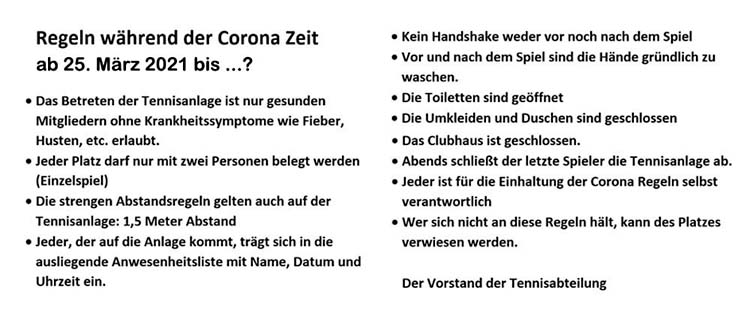 April 2021 - Wir sind bereits in der dritten Welle, die "Bundes-Notbremse" ist angeordnet mit Ausgangsbeschränkungen, Kontaktminimierungen, Maskenpflicht, Testen und Impfen. Im Tennissport sind Einzel mit 2 Personen möglich > Kommen-Spielen-Gehen! Der Beginn der Mannschaftsspiele ist auf Ende Mai verschoben.